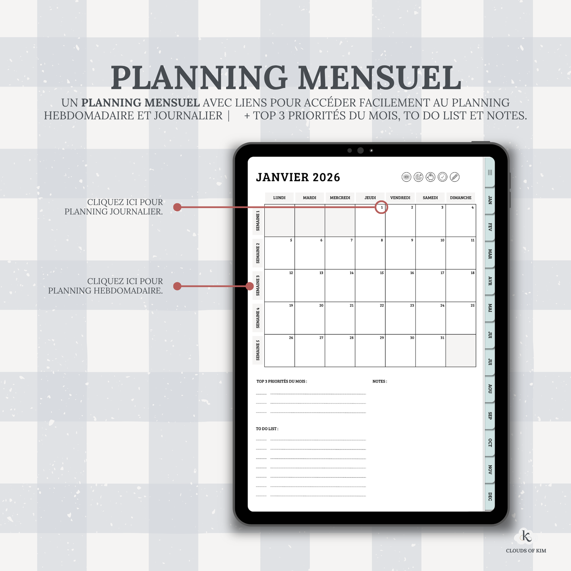↪ Un Planning journalier (+ Top 3 priorités du mois, To do list, notes et calendrier mensuel).