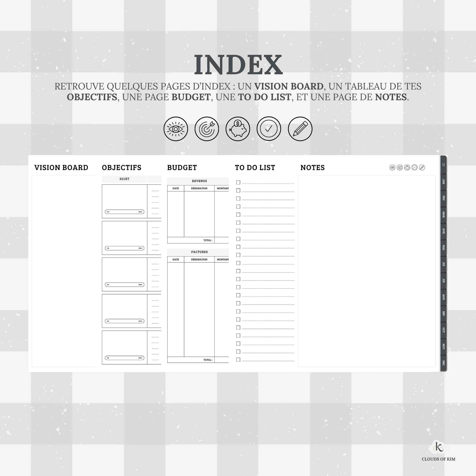 ↪ INDEX : une page Vision Board, une page Objectifs, une page Budget, une page To Do List et une page Notes.