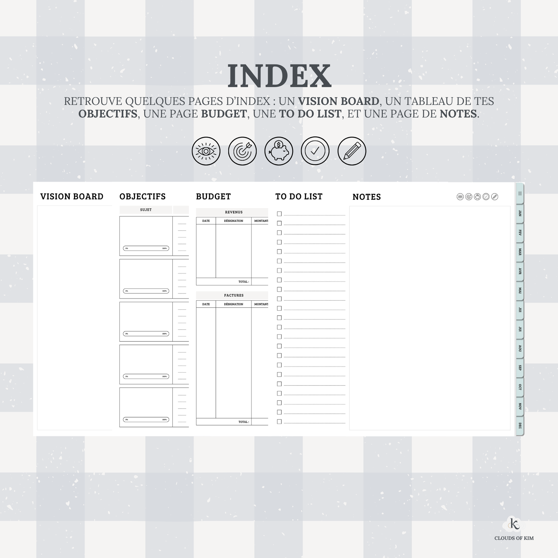 ↪ INDEX : une page Vision Board, une page Objectifs, une page Budget, une page To Do List et une page Notes.