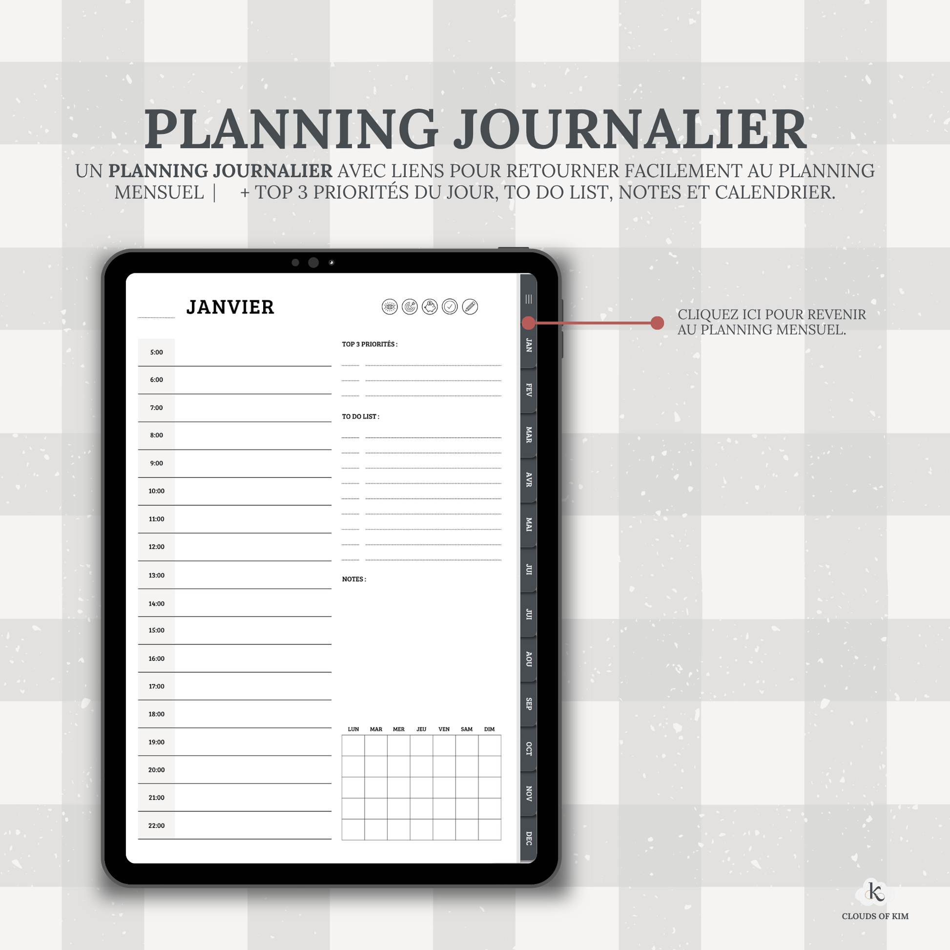 ↪ Un Planning journalier (+ Top 3 priorités du mois, To do list, notes et calendrier mensuel).